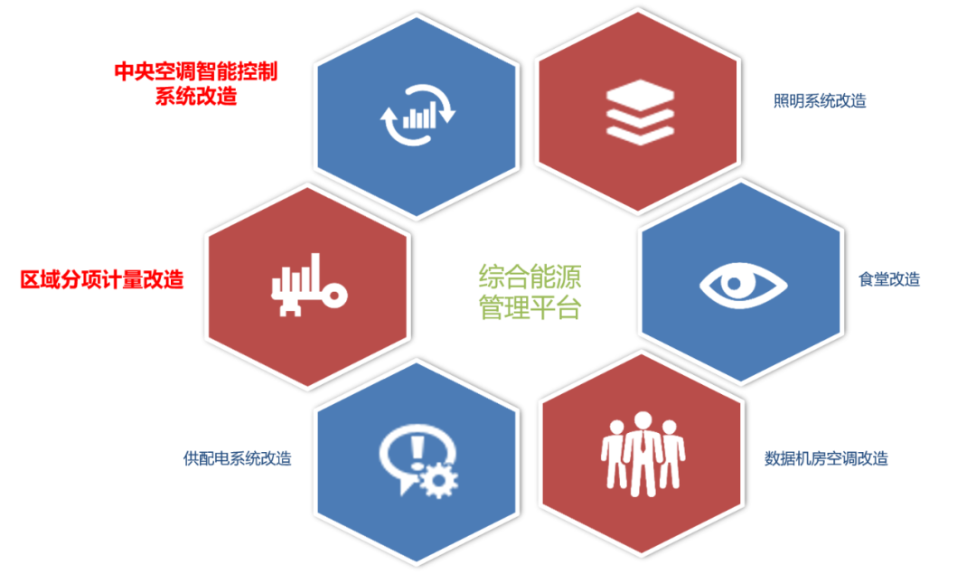 一期E座和二期ABCD座,合計改造面積26.6萬平。分為:水、電、燃?xì)獾姆謶舴猪椨嬃?,中央空調(diào)的智能控制,智能照明系統(tǒng),供配電系統(tǒng)智能化監(jiān)控,食堂改造,數(shù)據(jù)機房空調(diào)改造,綜合能源管理平臺建設(shè)等7個部分。