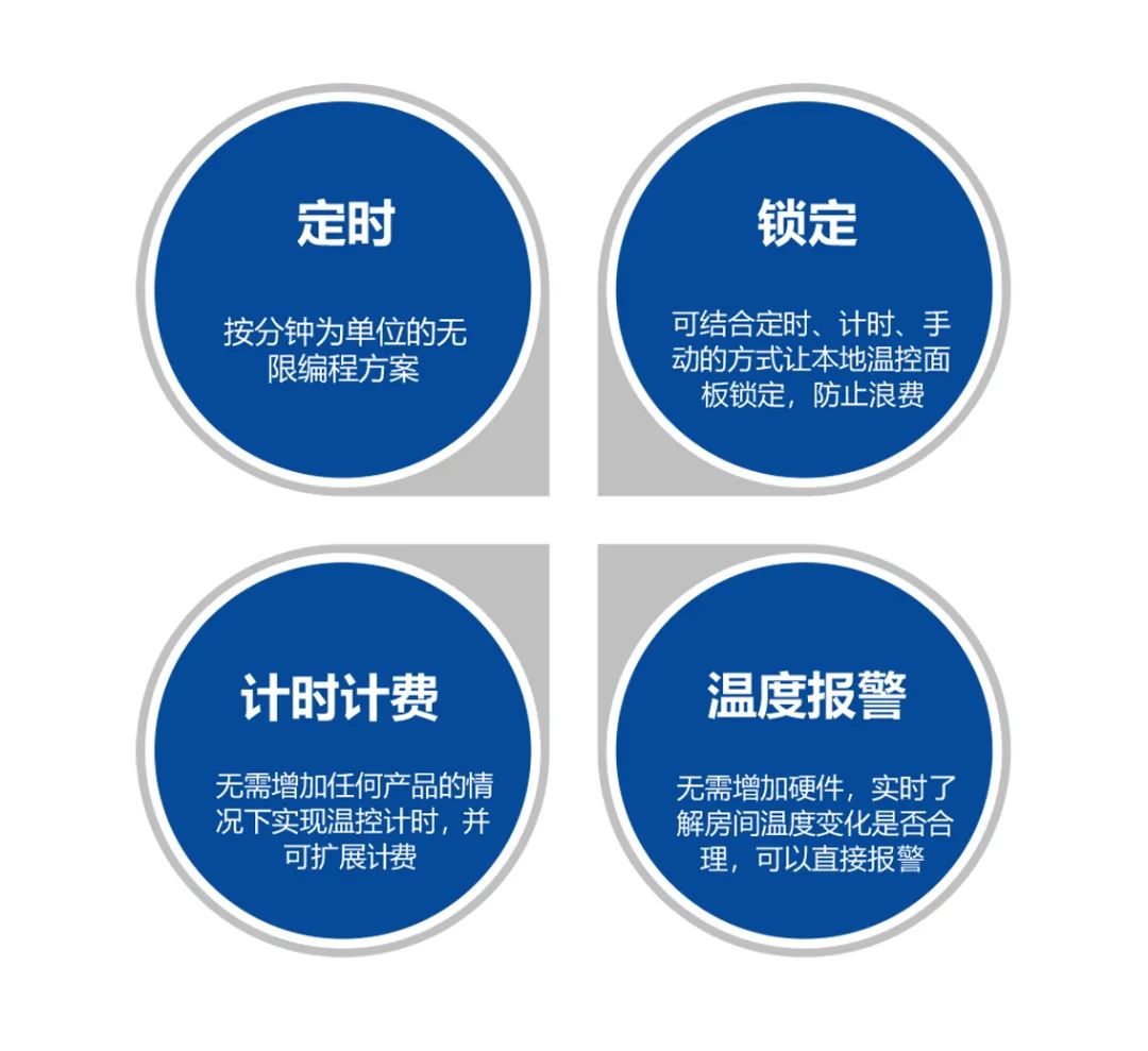 根據《公共建筑空調溫度控制標準》建議,夏季室內空調溫度設置不得低于26攝氏度,冬季室內空調溫度設置不得高于20攝氏度。系統可以通過程序集中控制聯網溫控器,將溫度始終設置在合理的范圍,并實時監測設備運行狀態,并通過程序進行集中管理,限制過分用能,減少了能耗。