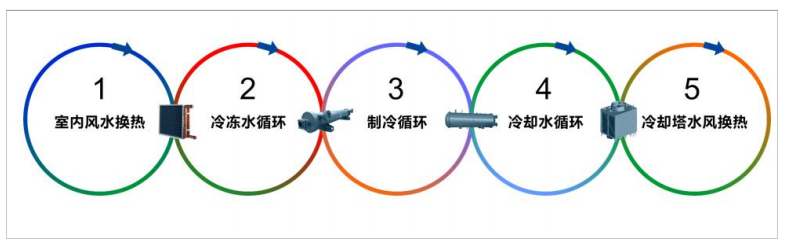 全面精細化實現(xiàn)高效制冷機房設(shè)計,歸納于對五大循環(huán)系統(tǒng)的深入研判后的能效提升,它們分別是:1)室內(nèi)水風(fēng)循環(huán);2)冷水循環(huán);3)制冷循環(huán);4)冷卻水循環(huán);5)冷卻塔水風(fēng)換熱循環(huán),如下圖所示。其中與冷卻水系統(tǒng)節(jié)能直接相關(guān)的循環(huán)有冷卻水循環(huán)和冷卻塔風(fēng)水換熱循環(huán)。冷卻水循環(huán)涉及冷卻水供回水溫差;冷卻塔水風(fēng)換熱循環(huán)涉及冷卻塔供水溫度和室外濕球溫度的溫差,是為兩個溫差。