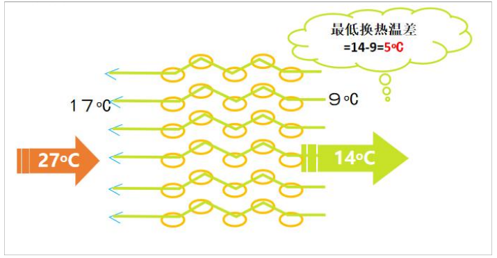過去很長的一段時間內(nèi)冷水系統(tǒng)大溫差的設(shè)計及其理論為暖通設(shè)計行業(yè)所耳熟能詳,相關(guān)論文闡述也很多,冷水大溫差多為降低冷水出水溫度,同時提高冷水回水溫度為代表(姑且叫第一類大溫差)如典型溫差為 7℃即 6-13℃循環(huán)溫度,末端采用吊裝空調(diào)箱的大型購物中心項目,如筆者親身經(jīng)歷的合肥萬科廣場購物中心項目,見文獻[2]。這類大溫差的本質(zhì)是:在主機供水溫度(出水溫度低于 7℃)和既定溫差(溫差大于 5℃)下選型同時選擇能效比高的冷水泵,在滿足計算制冷量和規(guī)范的主機制冷量前提下,主機能耗的增加的數(shù)值小于水泵能耗的下降的數(shù)值,使得冷水循環(huán)側(cè)的主機和水泵的綜合能效最小。近年來出現(xiàn)的冷水側(cè)大溫差即中溫冷水機組的大溫差(姑且叫第二類大溫差),即通過改進末端空調(diào)設(shè)備結(jié)構(gòu)形式,只要空調(diào)機組出風(fēng)干球溫度控制在≤14℃以下,系統(tǒng)可以提供不同的供回水溫度(供水溫度大于 7℃,回水溫度大于 12℃),冷水系統(tǒng)可以提供 9.5℃-14.5℃、8.8℃-14.8℃、8℃-15℃等不同的供回水溫度組合,如文獻三[3]中南京三山街大型購物中心高效制冷機房的大溫差供回水溫度為 10℃-16℃;文獻四[4]提到的五邑大學(xué)教學(xué)樓高效制冷機房的供回水溫度為 10℃-18℃,當(dāng)然該項目較為特殊,是配合了改進的末端(需要采用全新的中溫末端設(shè)備,從換熱能力、出風(fēng)溫度、風(fēng)側(cè)壓降、水側(cè)壓降等四個維度進行全面優(yōu)化)及輔助電風(fēng)扇的采用,能達到所需要的溫濕度要求。因此第二個階段的冷水大溫差是提高供水溫度,同時提高供回水溫差的形式。下圖為中溫水大溫差的六排管逆流換熱圖。采用中溫變頻空調(diào)系統(tǒng)制冷機房某項目能效可達到 6.85。