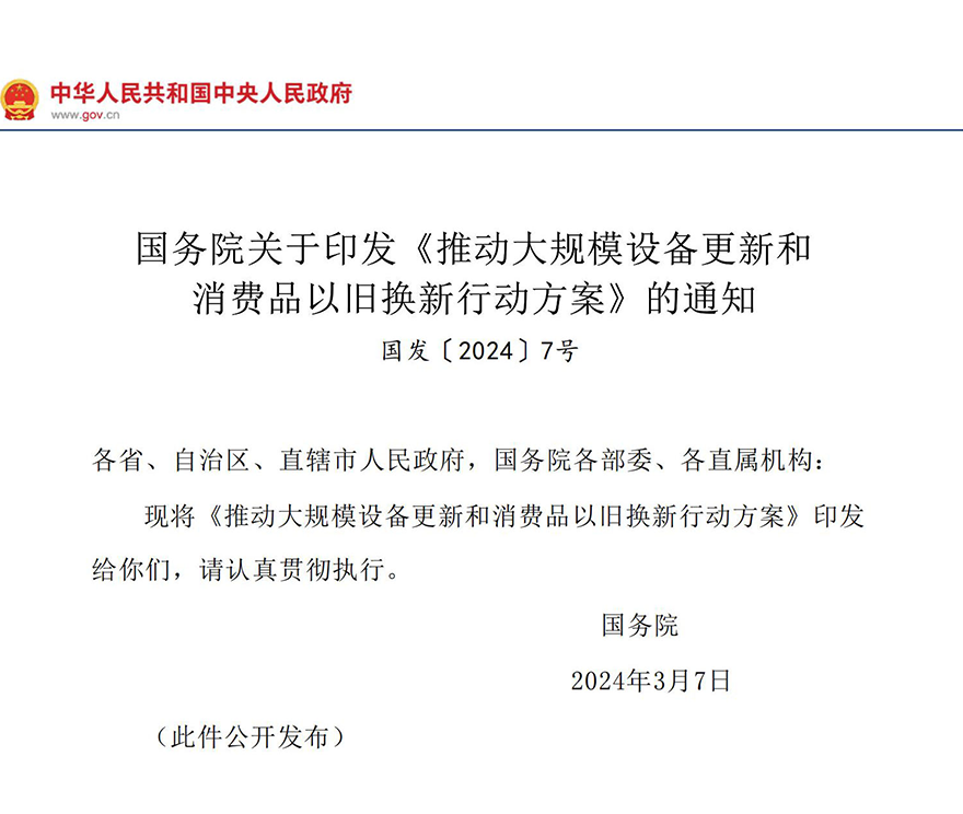 3月13日晚間,國務院正式印發《推動大規模設備更新和消費品以舊換新行動方案》。