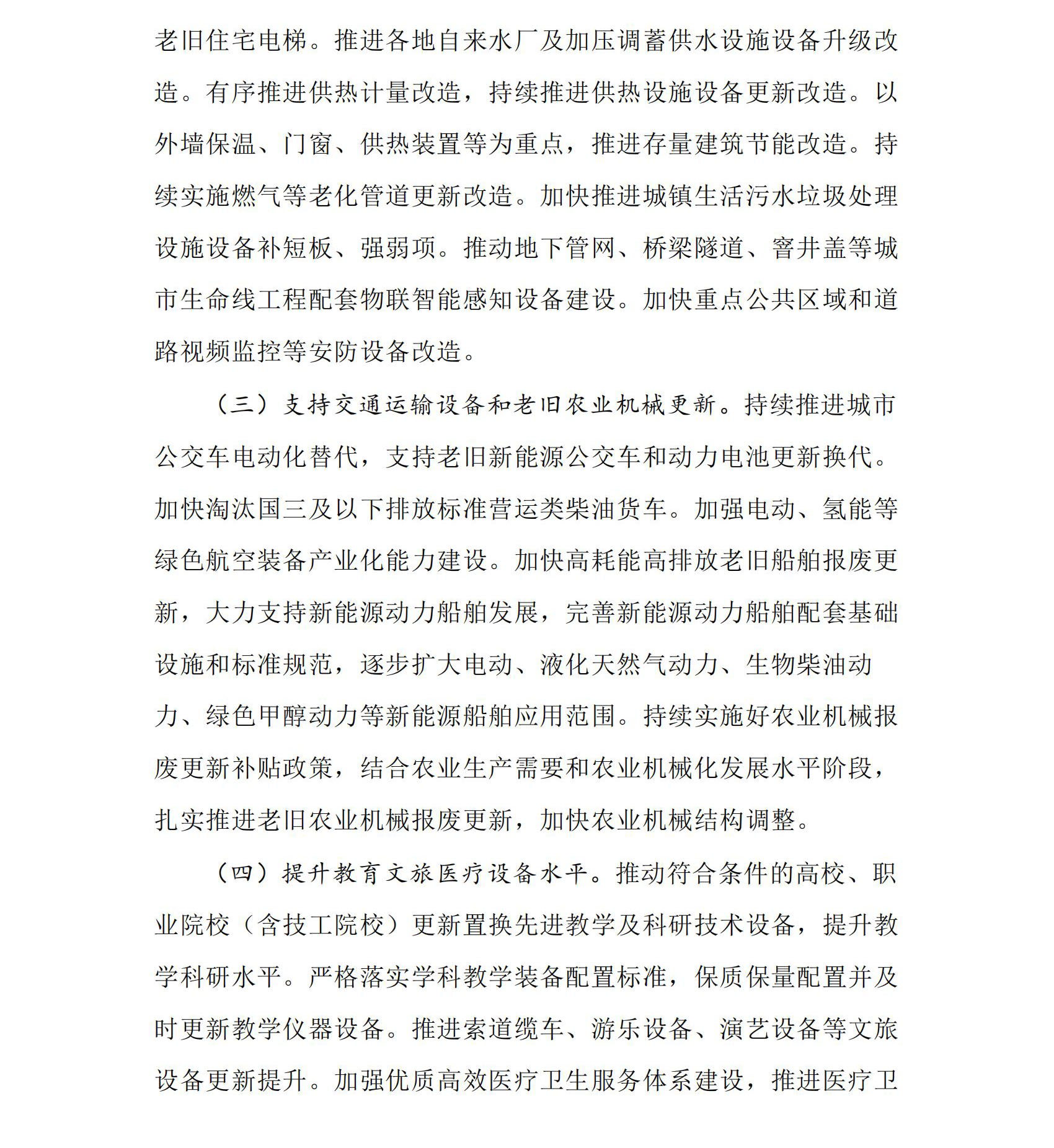 (二)加快建筑和市政基礎設施領域設備更新。圍繞建設新型城鎮化,結合推進城市更新、老舊小區改造,以住宅電梯、供水、供熱、供氣、污水處理、環衛、城市生命線工程、安防等為重點,分類推進更新改造。加快更新不符合現行產品標準、安全風險高的老舊住宅電梯。推進各地自來水廠及加壓調蓄供水設施設備升級改造。有序推進供熱計量改造,持續推進供熱設施設備更新改造。以外墻保溫、門窗、供熱裝置等為重點,推進存量建筑節能改造。持續實施燃氣等老化管道更新改造。加快推進城鎮生活污水垃圾處理設施設備補短板、強弱項。推動地下管網、橋梁隧道、窨井蓋等城市生命線工程配套物聯智能感知設備建設。加快重點公共區域和道路視頻監控等安防設備改造。