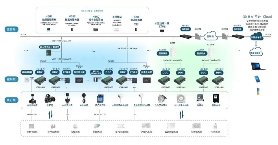HAI平臺樓宇自控系統具有強大的接口能力,可以實現對住區冷熱源、空調機組、智能照明等設備設施的自動化管理。海林IoT-DDC 憑借強大的運算能力和豐富的接口(3 個 RS-485)可直接接入多個子系統,冷熱源機組控制、能耗狀態、室內環境控制均可在一個設備內完成,實現真正的局部區域本地化實現能源樓控的解決方案。