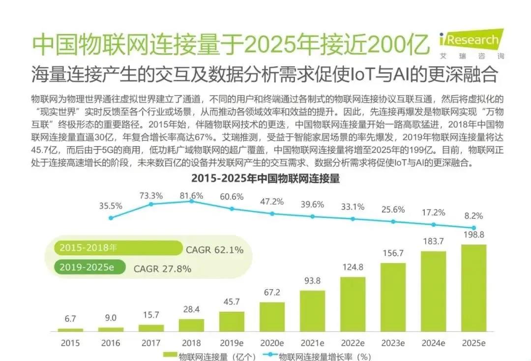 白皮書顯示,預(yù)計2025年我國物聯(lián)網(wǎng)連接數(shù)近200億個,萬物喚醒、海量連接將推動各行各業(yè)走上智能道路。2019年,受益于城市端AIoT業(yè)務(wù)的規(guī)模化落地及邊緣計算的初步普及,中國AIoT市場規(guī)模突破3000億大關(guān)直指4000億量級,由于AIoT在落地過程中需要重構(gòu)傳統(tǒng)產(chǎn)業(yè)價值鏈,未來幾年發(fā)展節(jié)奏較為穩(wěn)定。當(dāng)前AIoT技術(shù)和商業(yè)快速落地,然而,認(rèn)知智能層面的發(fā)展仍然較慢,行業(yè)標(biāo)準(zhǔn)與規(guī)范化不足,大規(guī)模物聯(lián)網(wǎng)設(shè)備的安全問題也有待重視。