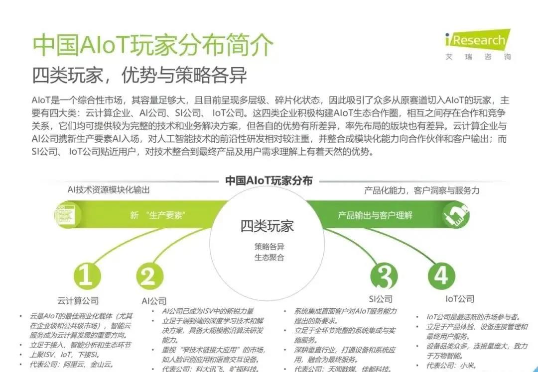 白皮書指出,AIoT是一個綜合性市場,其容量足夠大,且目前呈現(xiàn)多層級、碎片化狀態(tài),因此吸引了眾多從原賽道切入AIoT的玩家,主要有四大類:云計算企業(yè)、AI公司、SI公司、IoT公司。艾瑞推測,受益于智能家居場景的率先爆發(fā),2019年物聯(lián)網(wǎng)連接量將達(dá)45.7億,而后由于5G的商用,低功耗廣域物聯(lián)網(wǎng)的超廣覆蓋,中國物聯(lián)網(wǎng)連接量將增至2025年的199億。