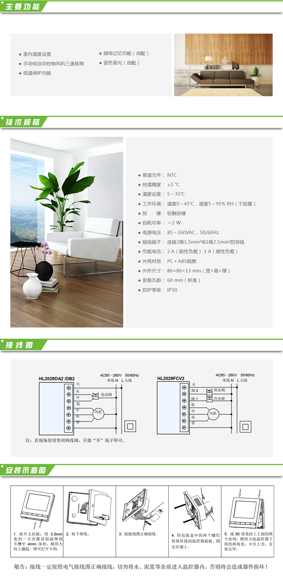 HL2029 系列室內溫控器適用于家庭、辦公樓、寫字樓、學校等場所的溫度控制,控 制風機盤管和電動閥,通過按鍵可選擇制熱、制冷功能。