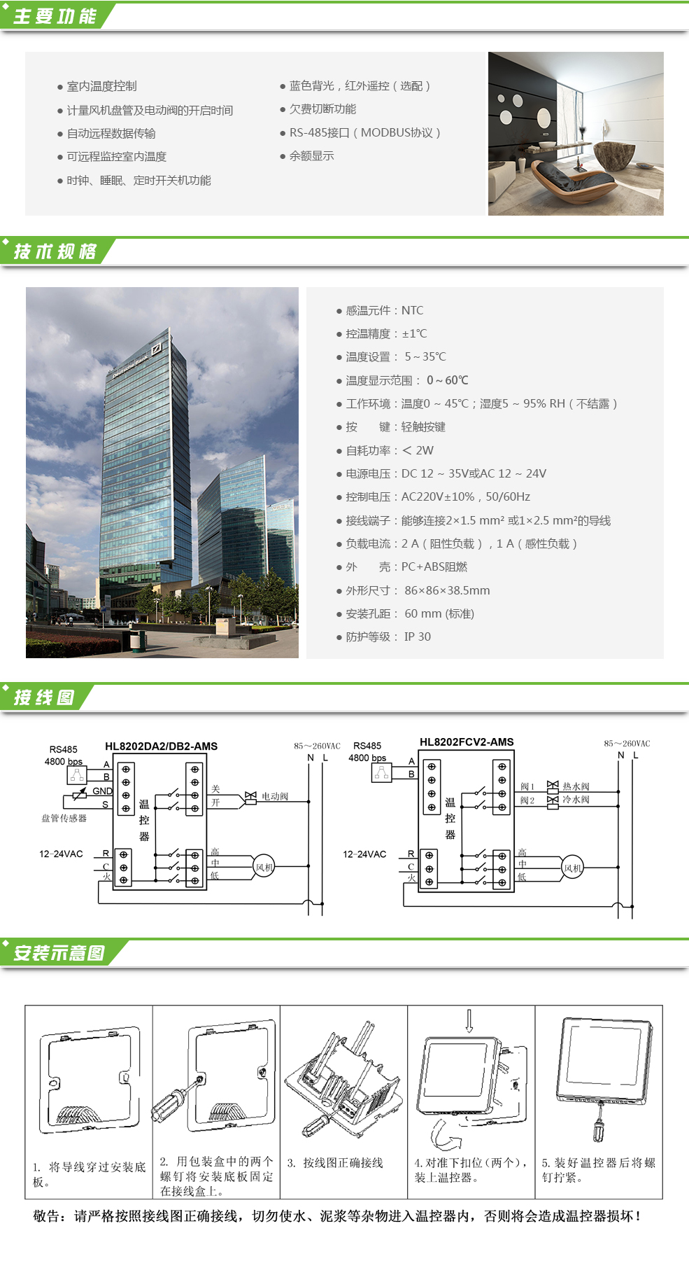 時間型溫控器HL8202AM-D2適用于寫字樓、商業地產及家庭居室的溫度控制及對空調使用的計量計費。其具備普通溫控器調節室內溫度的功能,同時具有對風機盤管的三速運行時間、電動閥的開關時間進行計量,并自動遠程傳輸數據,同時可實現遠程監控。