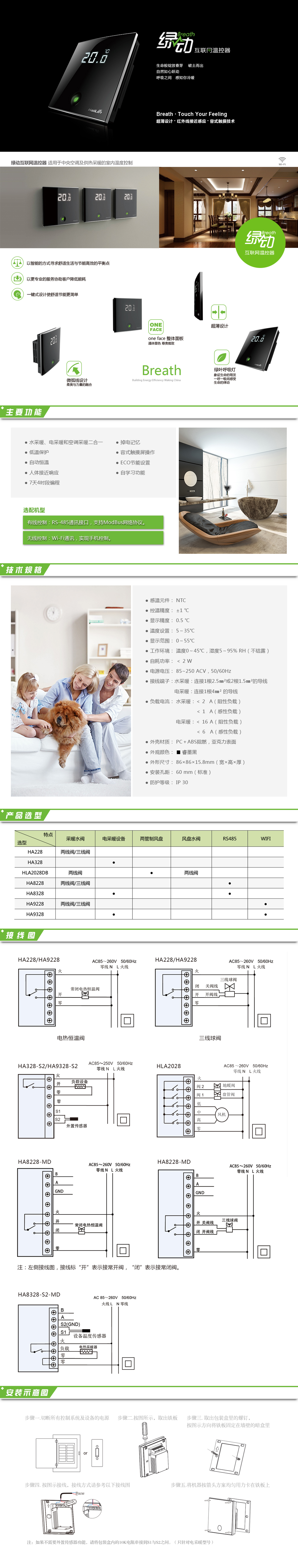 綠動采暖溫控器包括“本地控制、有線控制、無線控制”三種類型,適用于家庭地板采暖系統或散熱器采暖系統的室內溫度控制。微弧線曲面設計彰顯柔美與力量融合。面板整體睿墨含蓄尊貴雅致。綠葉呼吸燈時尚點綴,如呼吸間感受生命律動象征生命萌發。