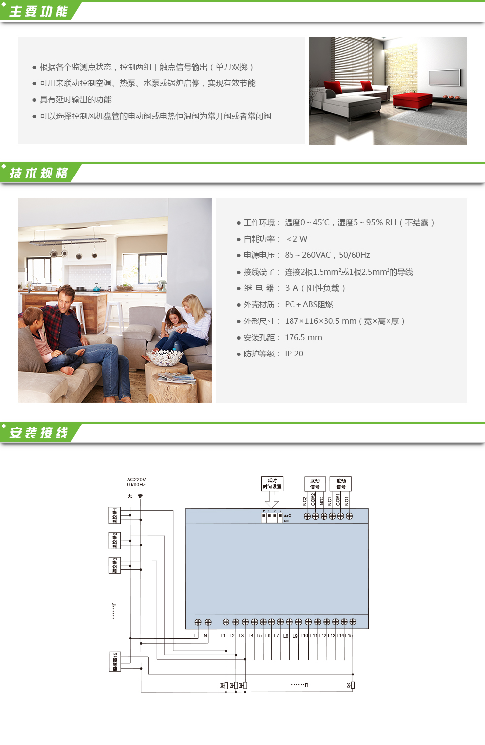 聯機控制器HL309-15,可自動檢測各個風機盤管或電熱恒溫閥的工作狀態,根據風機盤管或電熱恒溫閥的開關,輸出干觸點的聯機控制信號。當所有風機盤管或電熱恒溫閥關閉后,輸出的干觸點斷開;而當有一個或多個風機盤管或電熱恒溫閥啟動后,輸出的干觸點閉合。合理分配能源,減少能源浪費,能達到真正的“既舒適又節能”的目的。