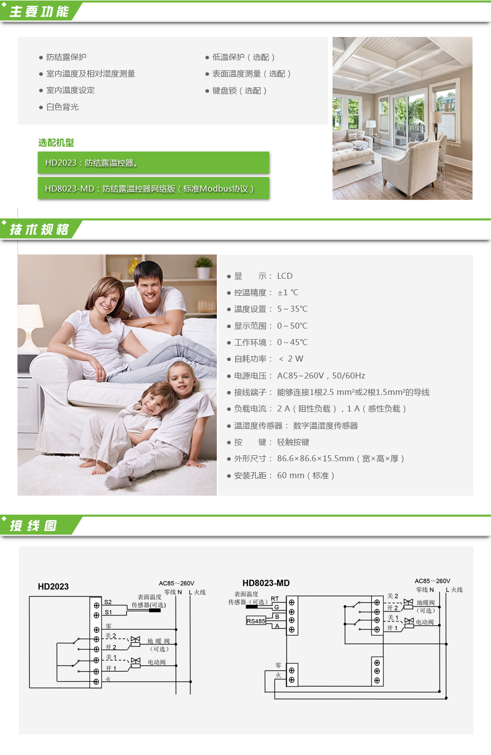 防結露溫控器,適用于家庭、辦公樓、寫字樓、學校等場所的室內溫度控制,具有防止毛細管網在制冷時結露的功能。采用靈敏的溫濕度傳感器作為感溫元件檢測室內溫度,并與用戶設定的溫度相比較后自動控制電動閥的啟停,以達到室內恒溫的目的。
