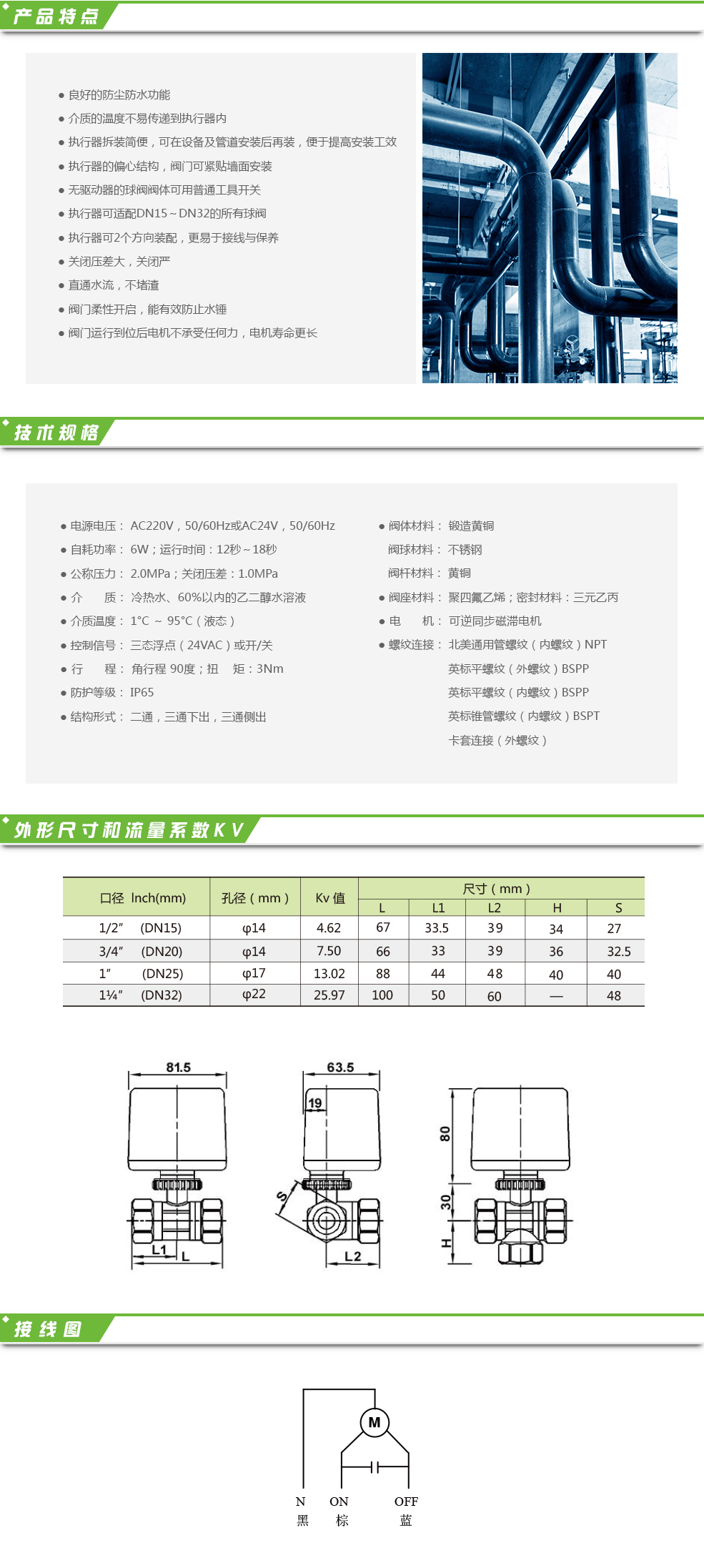 BV03系列電動球閥主要用于中央空調冷熱水系統,按實際需要精確控制冷、熱介質的流量,不會造成溫度的劇烈變化,達到實時精確控制室溫之目的。控制閥由雙向電機驅動,電機與溫控器通過公共端、開啟端、閉合端鏈接。溫控器不斷采樣、處理現場數據,發出控制信號,令電動球閥電機運行或停止,控制電動球閥的開閉程度,冷水或熱水進入風機盤管,為房間提供冷氣或暖氣;當室溫達到溫 ...