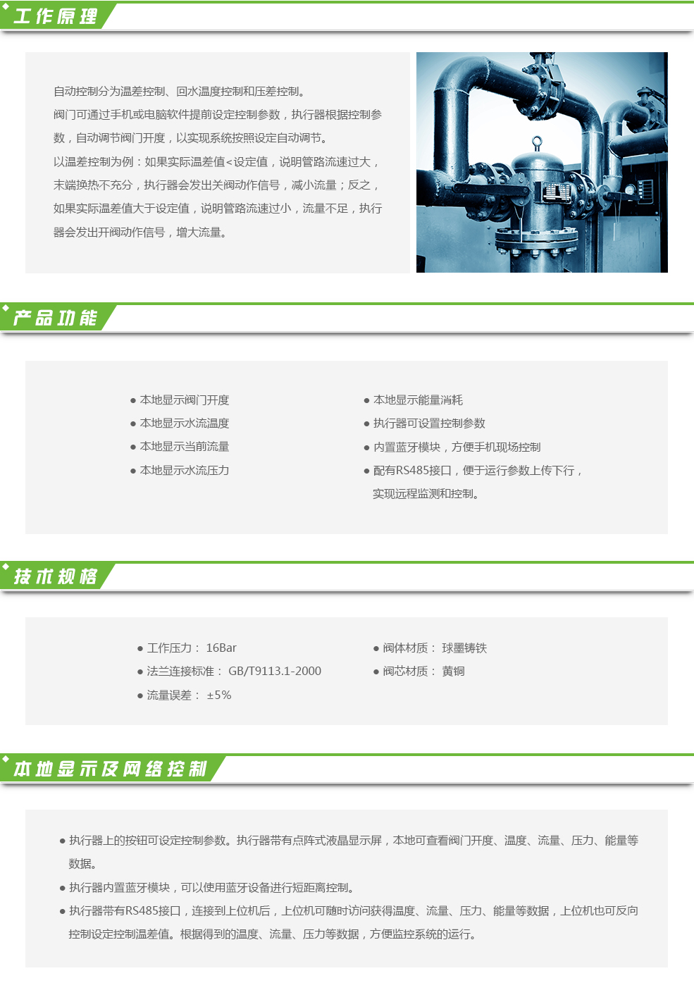 智慧調(diào)節(jié)閥是基于嵌入式軟件、傳感技術(shù)、人工智能算法、流體模擬計算等技術(shù),結(jié)合傳感器、智能控制器、執(zhí)行器和調(diào)節(jié)閥等產(chǎn)品優(yōu)勢,實現(xiàn)智能化操作的閥門裝置。可應(yīng)用于建筑管網(wǎng)內(nèi)用水的溫差、回水溫度及壓差的調(diào)節(jié)控制。