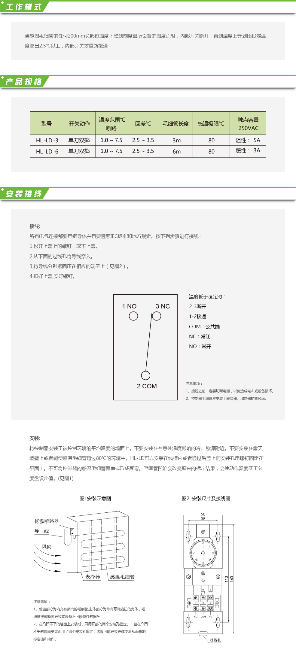 HL-LD低溫?cái)嗦房刂破鞴ぷ饔趩蔚峨p擲模式。典型應(yīng)用包括:低溫條件下用于保護(hù)熱交換器、表冷器以及液體工作管路為避免過(guò)冷或結(jié)冰。當(dāng)感溫毛細(xì)管的任何200mm長(zhǎng)部位溫度下降到刻度盤(pán)所設(shè)置的溫度點(diǎn)時(shí),內(nèi)部開(kāi)關(guān)斷開(kāi),直到溫度上升到比設(shè)定溫度高出2.5℃以上,內(nèi)部開(kāi)關(guān)才重新接通。