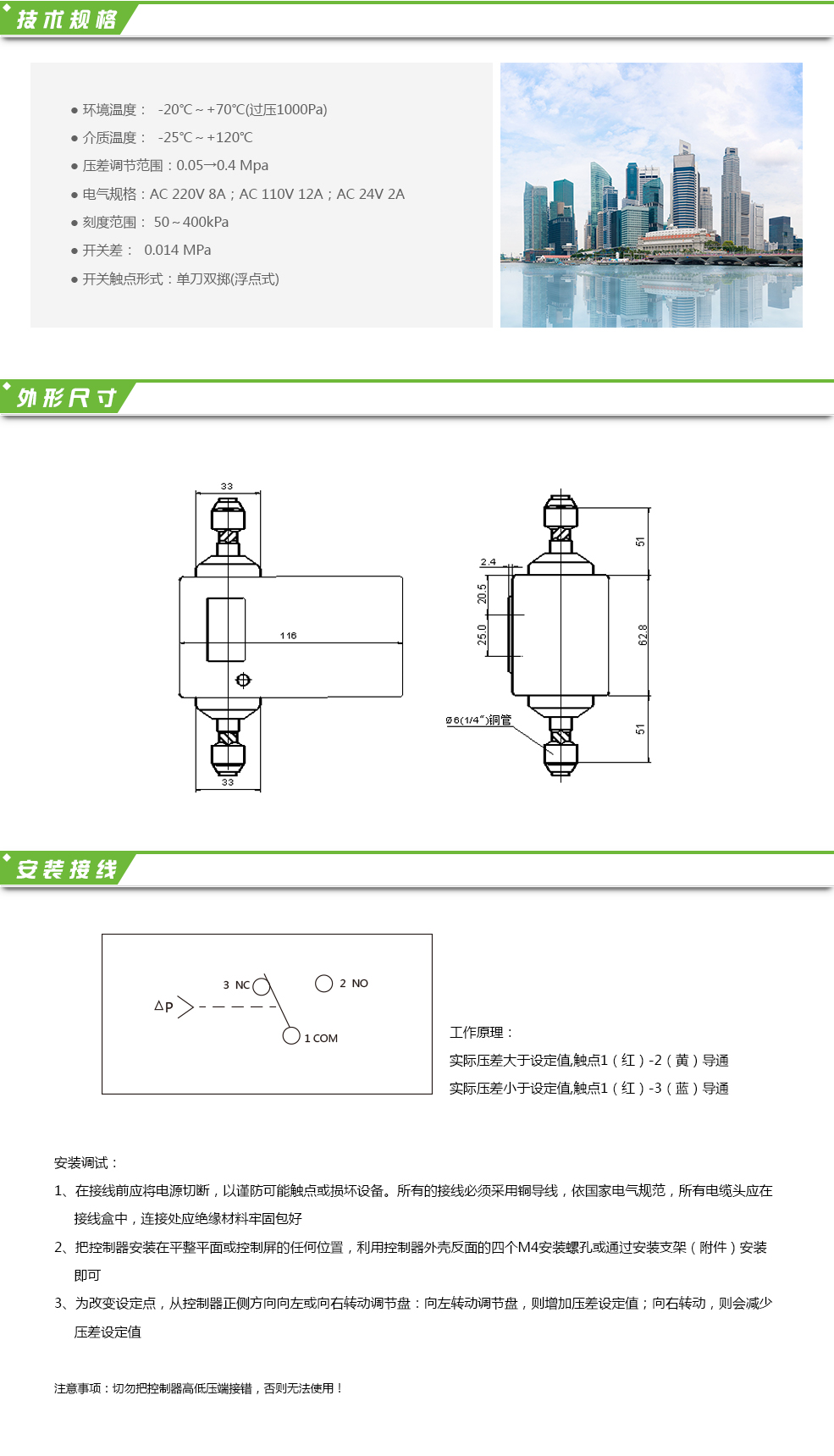HL-PD01壓差開關通常用于水系統,控制供水管路與回水管路間的壓差,控制器的觸點動作接通觸點后,使馬達驅動器操縱閥門。一種典型的應用是把閥門安裝在系統水泵附近的旁通管路中。當系統壓差增大而超過控制器設定值時,閥門則進而開大,使更多的水流經旁通閥,從而使系統壓差減小。相反,壓差的減小則導致閥門開度減小從而使系統壓差增加。